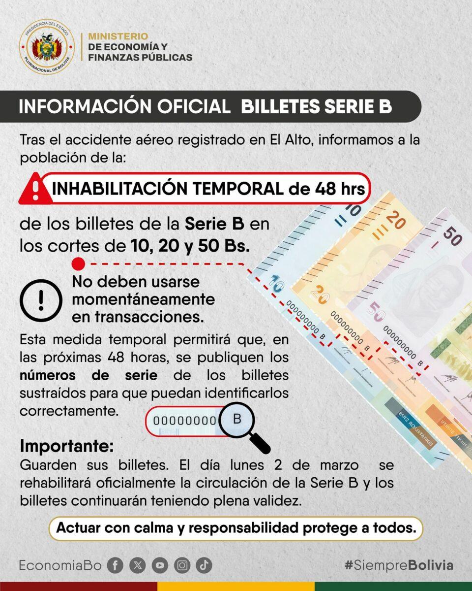 La Paz, 28 de feb 2026 (ATB Digital).- El Ministerio de Economía y Finanzas Públicas informó que la inhabilitación de los billetes de la Serie B es una medida de carácter temporal por 48 horas.