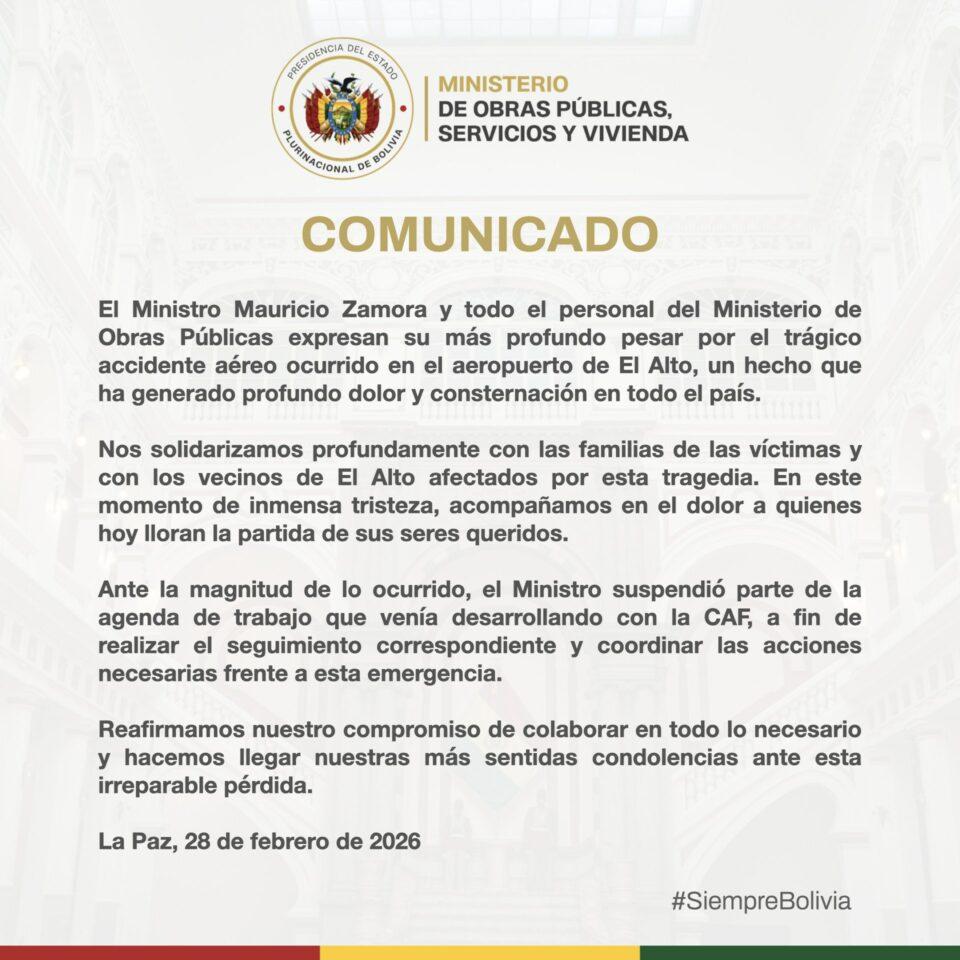 La Paz, 28 de feb 2026 (ATB Digital).- El Ministerio de Obras Públicas, Servicios y Vivienda expresó su profundo pesar por el trágico accidente aéreo ocurrido en el aeropuerto de El Alto, hecho que generó consternación en el país.