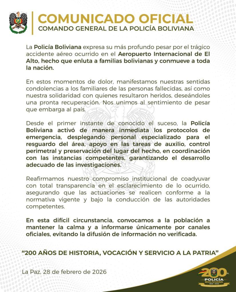 La Paz, 28 de feb 2026 (ATB Digital).- A través de un comunicado oficial, la Policía manifestó sus condolencias a los familiares de las personas fallecidas y su solidaridad con quienes resultaron heridos, deseándoles pronta recuperación.