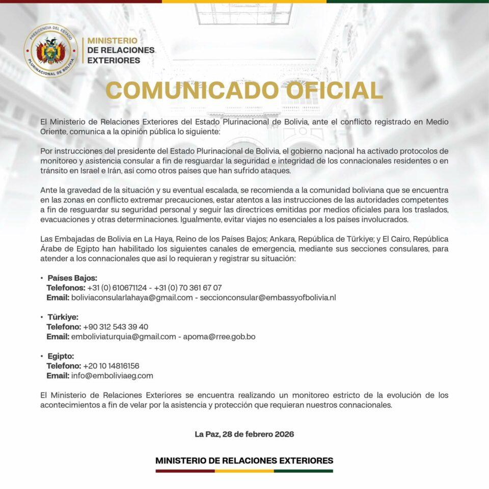 La Paz, 01 de mar 2026 (ATB Digital).- El Ministerio de Relaciones Exteriores de Bolivia emitió un comunicado oficial en el que informa la activación de protocolos de monitoreo y asistencia consular ante el conflicto registrado en Medio Oriente.