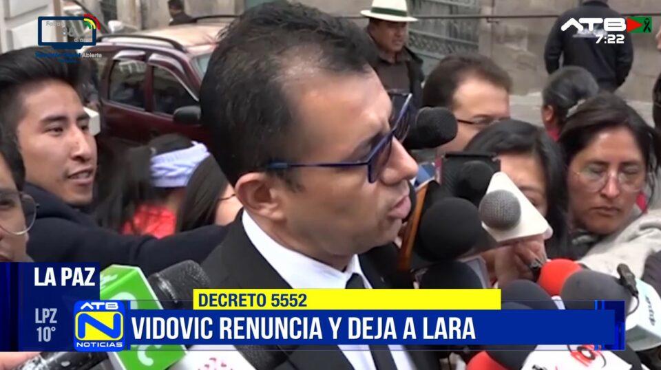La Paz, 03 de mar 2026 (ATB Digital).- Freddy Alejandro Vidovic renunció como asesor jurídico del vicepresidente Edmand Lara, argumentando la necesidad de preservar la estabilidad institucional. La dimisión ocurre luego de que la Fiscalía admitiera una denuncia en su contra por presunta usurpación de funciones, mientras el vicepresidente atribuyó las tensiones actuales a las decisiones del Gobierno.