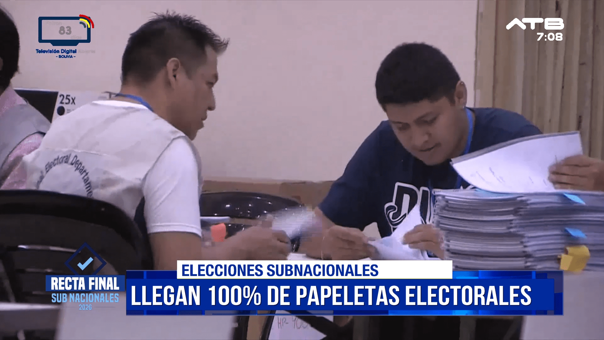 Cochabamba, 08 de mar 2026 (ATB Digital).- El Tribunal Electoral Departamental de Cochabamba informó que ya llegó el 100% de las papeletas electorales que serán utilizadas en las elecciones subnacionales previstas para el 22 de marzo. Este material formará parte de las 6.194 maletas electorales que serán armadas para su posterior distribución a los recintos de votación.