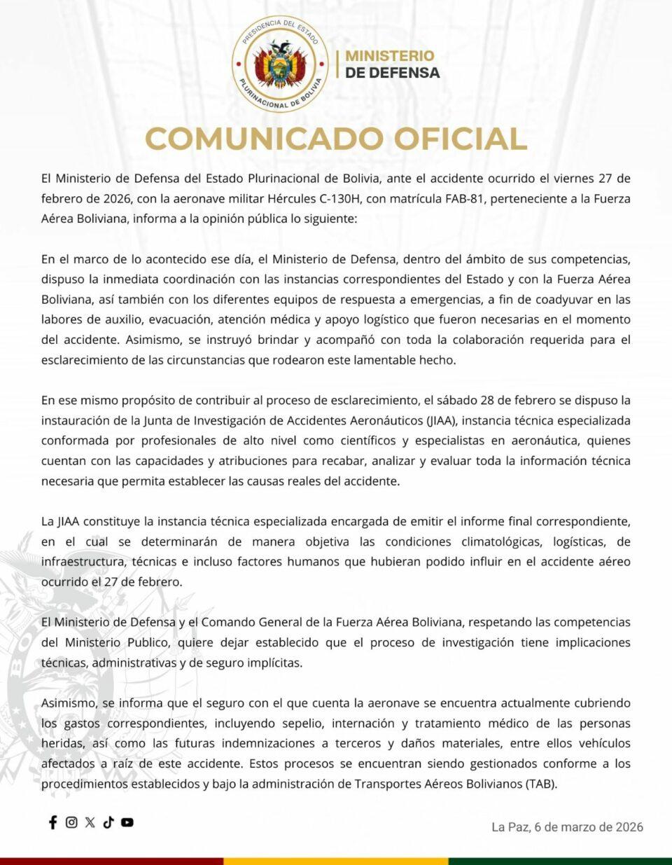 La Paz, 08 de mar 2026 (ATB Digital).- El Ministerio de Defensa de Bolivia informó la instauración de la Junta de Investigación de Accidentes Aeronáuticos (JIAA) para esclarecer las causas del accidente del avión militar Hércules C-130H ocurrido el 27 de febrero.