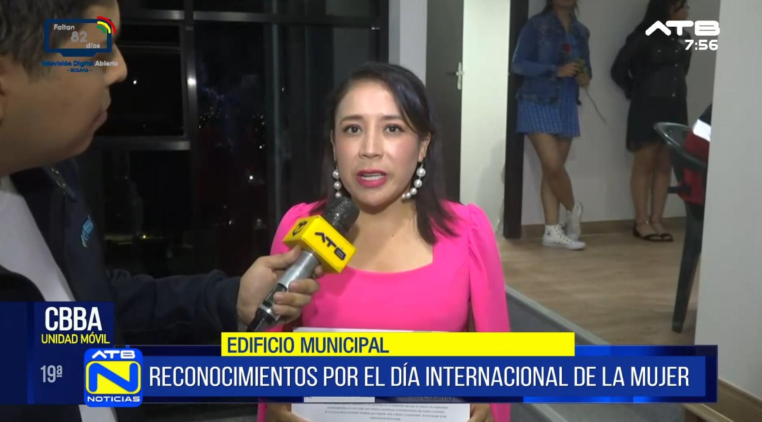 Cochabamba, 09 de mar 2026 (ATB Digital).- En el Edificio Municipal de Cochabamba se realiza un evento conmemorativo por el Día Internacional de la Mujer. El municipio reconoce a mujeres sobresalientes en distintos ámbitos. Verónica Sarmiento, periodista de la Red ATB, recibió uno de los reconocimientos por su destacada trayectoria, resaltando su compromiso y dedicación en el ejercicio periodístico.