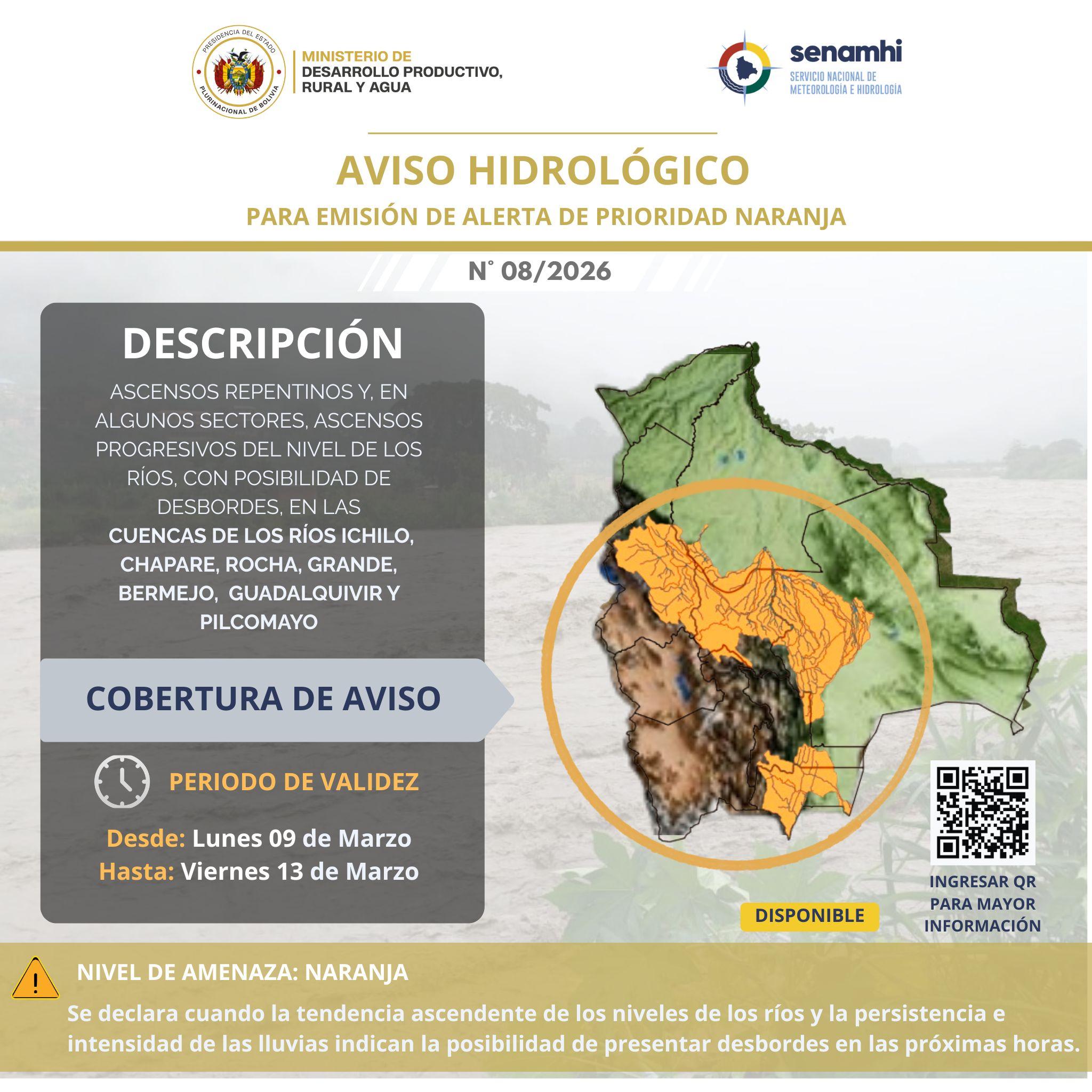 La Paz, 09 de mar 2026 (ATB Digital).- El Servicio Nacional de Meteorología e Hidrología (Senamhi) emitió una alerta naranja que estará vigente del 9 al 13 de marzo ante posibles ascensos repentinos y progresivos en el nivel de varios ríos, lo que podría provocar desbordes. La advertencia alcanza a las cuencas de los ríos Ichilo, Chapare, Rocha, Grande, Bermejo, Guadalquivir y Pilcomayo, por lo que se recomienda a la población de zonas cercanas mantenerse atenta a los reportes oficiales y tomar precauciones.
