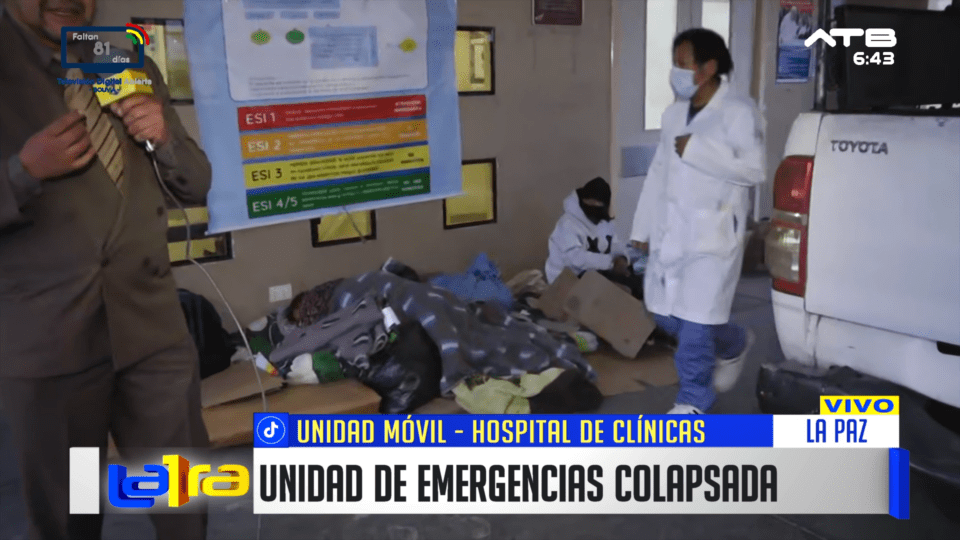 La Paz, 10 de mar 2026 (ATB Digital).- La unidad de emergencias del Hospital de Clínicas en La Paz se encuentra colapsada. Pacientes y familiares esperan atención desde hace varias horas, e incluso algunos permanecen en el piso a la espera de que sus familiares puedan ser atendidos.