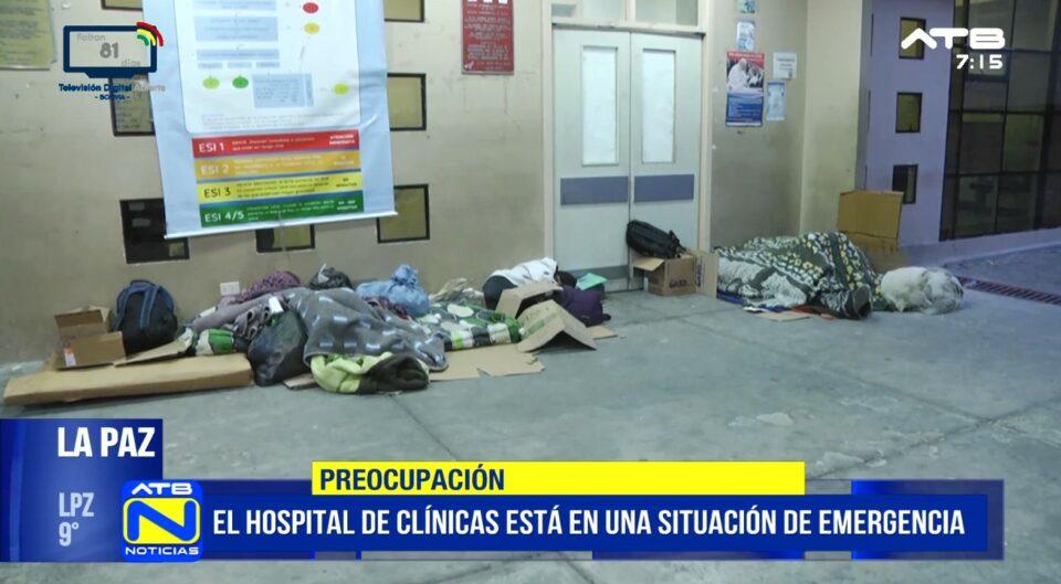 La Paz, 10 de mar 2026 (ATB Digital).- El colapso en el Hospital de Clínicas de La Paz obliga a pacientes y familiares a pasar la noche en colchones en la entrada de emergencias, mientras esperan atención médica. La falta de insumos, medicamentos y personal evidencia la crisis hospitalaria, y los familiares denuncian deficiencias en el trato y la calidad de atención, a la espera de soluciones del Ministerio de Salud y la Gobernación.