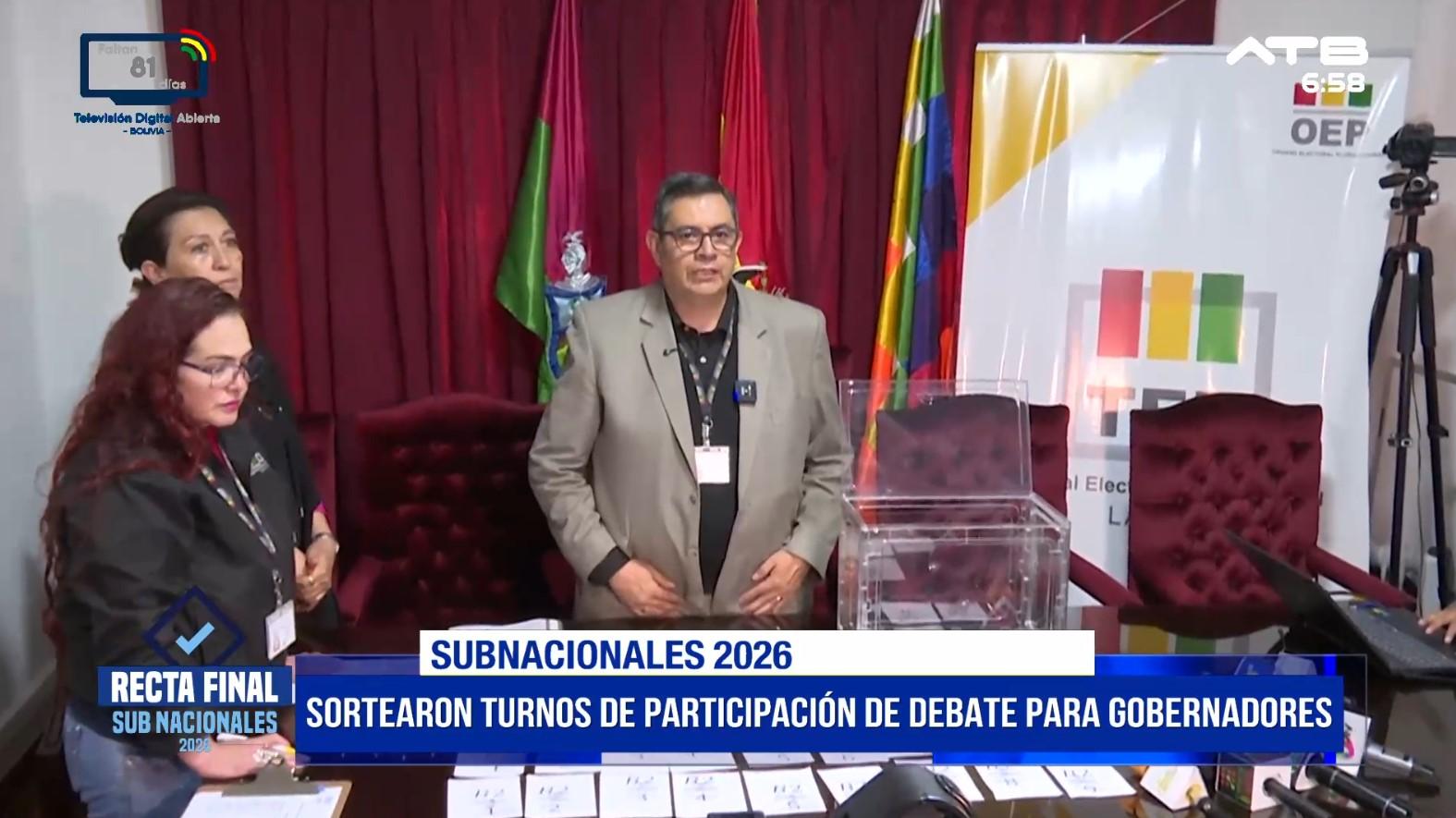 La Paz, 10 de mar 2026 (ATB Digital).- A 12 días de las elecciones subnacionales en Bolivia, el Tribunal Supremo Electoral (TSE) realizó el sorteo de ubicación y orden de participación para el debate de candidatos a la Gobernación del departamento de La Paz. En el acto se confirmó la presencia de las 17 organizaciones políticas que participan en el proceso electoral, informó el secretario de Cámara, Fernando Arteaga.
