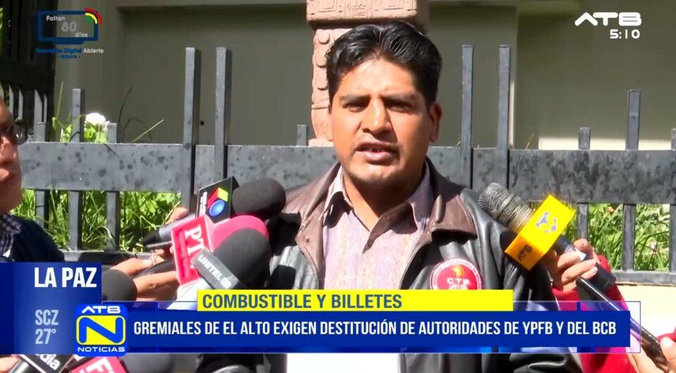 La Paz, 11 de mar 2026 (ATB Digital).- El dirigente gremial de El Alto, Toño Siñani, cuestionó la falta de respuestas del Gobierno ante las denuncias por la presunta mala calidad del combustible y los problemas con los billetes de la serie B. El sector exige la destitución del ministro de Hidrocarburos, del presidente de YPFB y la renuncia del titular del Banco Central de Bolivia.