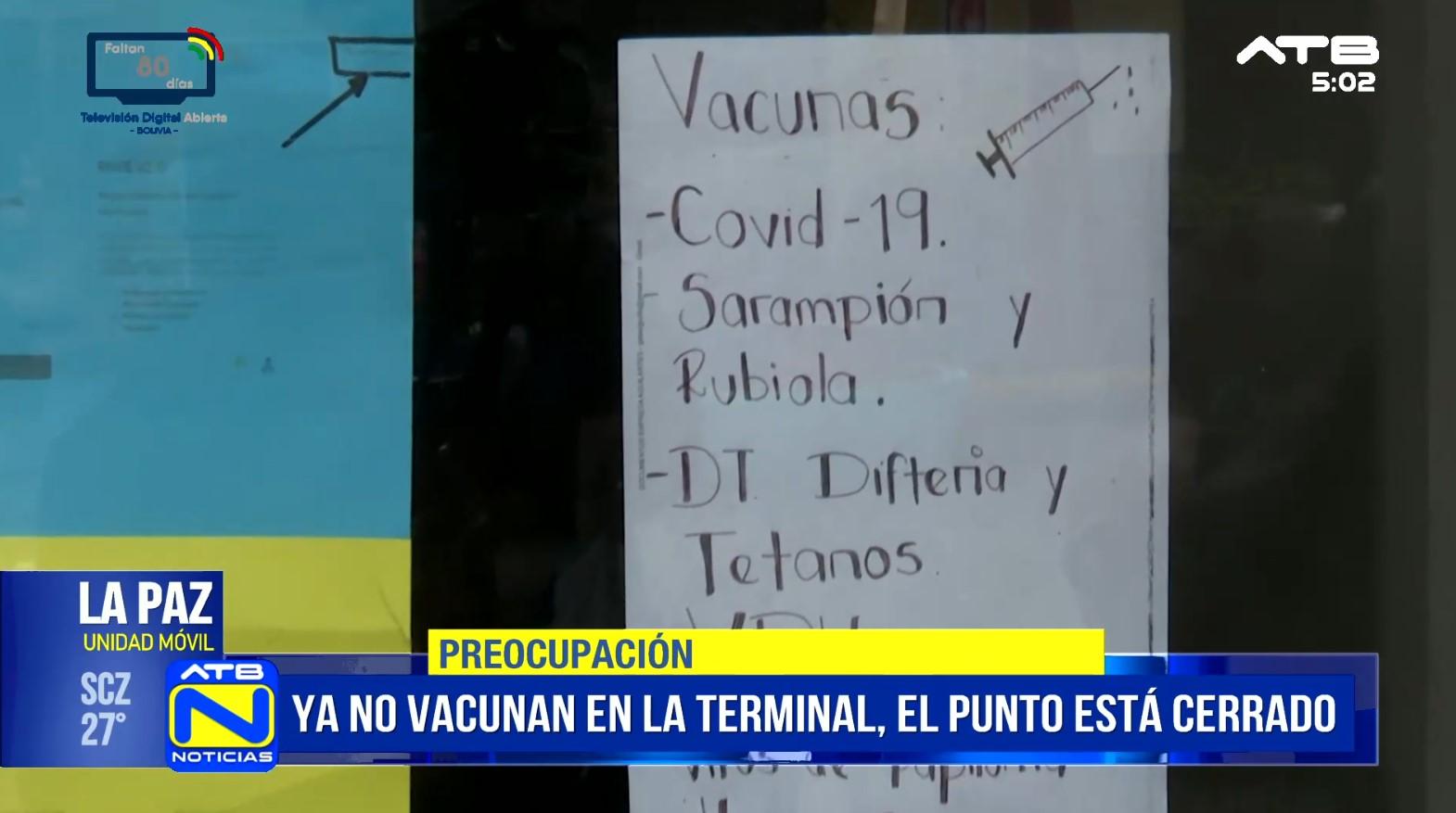 La Paz, 11 de mar 2026 (ATB Digital).- Viajeros que llegan a la Terminal de Buses de La Paz reportan que el punto de vacunación que antes atendía entre 8 y hasta 12 horas ya no funciona. El espacio permanece cerrado y, según señalan, el servicio dejó de operar hace tiempo, por lo que las personas que se trasladan ya no pueden acceder a vacunas en este lugar.