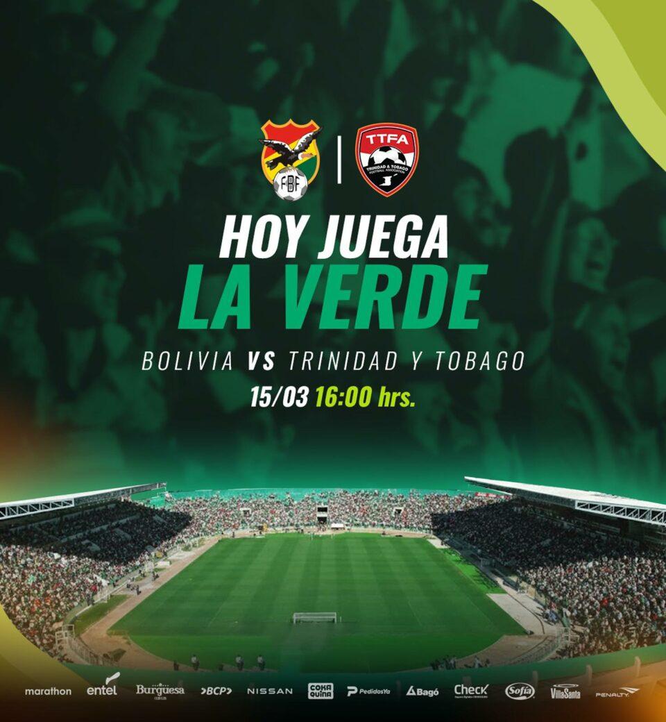 Santa Cruz, 15 de mar 2026 (ATB Digital).- La Selección Boliviana jugará este domingo 15 de marzo un partido amistoso frente a Trinidad y Tobago en el estadio Ramón “Tahuichi” Aguilera de Santa Cruz. El encuentro se disputará a las 16:00 y forma parte de la preparación de la Verde con miras al repechaje del Mundial 2026.