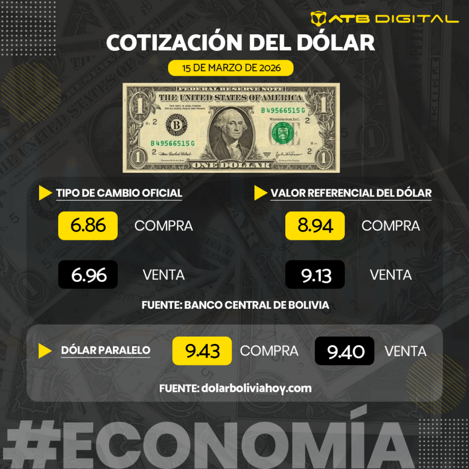La Paz, 15 de mar 2026 (ATB Digital).- El Banco Central de Bolivia (BCB) dio a conocer el tipo de cambio referencial del dólar correspondiente a este domingo 15 de marzo. Asimismo, te presentamos la cotización del dólar en el mercado paralelo, de acuerdo con el portal dolarboliviahoy.com.