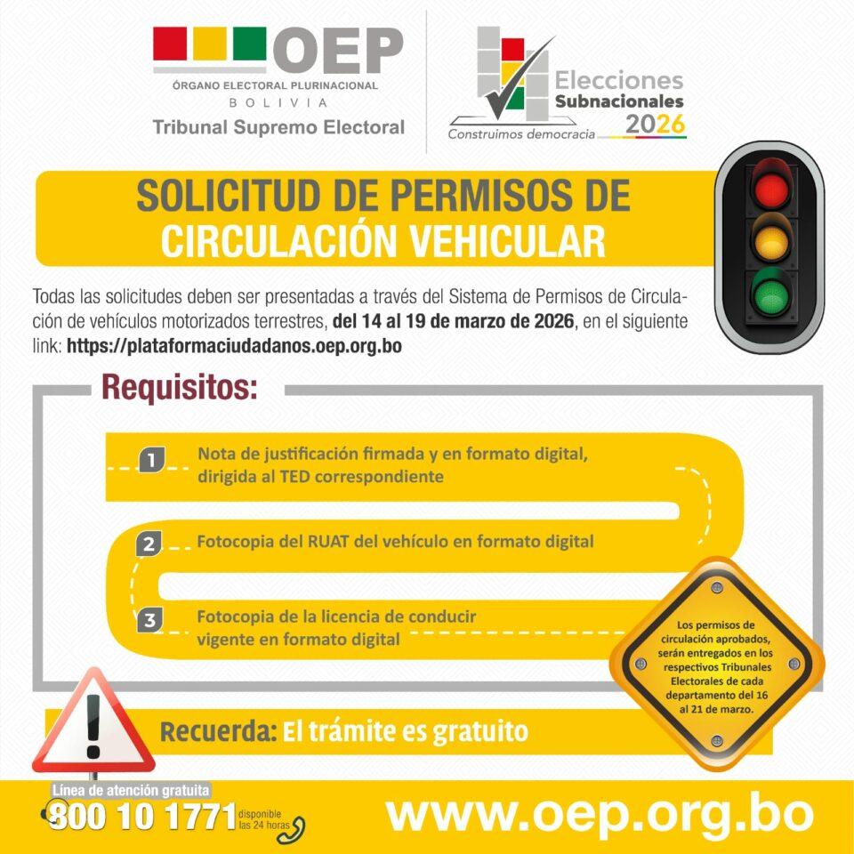 La Paz, 15 de mar 2026 (ATB Digital).- El Tribunal Supremo Electoral (TSE) informó que la ciudadanía puede solicitar el permiso de circulación vehicular para las elecciones subnacionales previstas para el 22 de marzo. El trámite estará habilitado del 14 al 19 de marzo, según lo establecido en el calendario electoral.