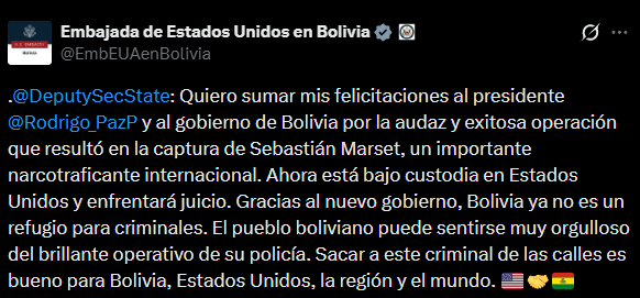 La Paz, 16 de mar 2026 (ATB Digital).- La Embajada de Estados Unidos en Bolivia publicó un mensaje en redes sociales en el que felicita al presidente Rodrigo Paz Pereira por la captura del narcotraficante uruguayo Sebastián Marset.