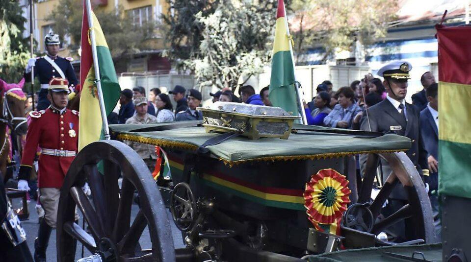 3. Oficiales Superiores de la Escuela de Comando y Estado Mayor Naval (ECEMN), colocan la urna en la carroza e inicia el traslado de la cureña con marcha, escoltados por máximas autoridades del país y Alto Mando Militar, rumbo a la plaza Abaroa.