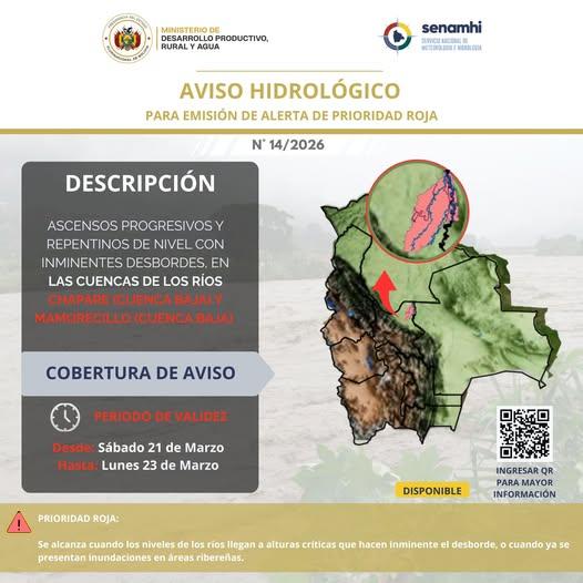 La Paz, 21 de mar 2026 (ATB Digital).- El Servicio Nacional de Meteorología e Hidrología (Senamhi) emitió dos avisos hidrológicos por el ascenso del nivel de ríos en distintas regiones del país, con alertas de prioridad roja y naranja vigentes desde el sábado 21 hasta el lunes 23 de marzo.