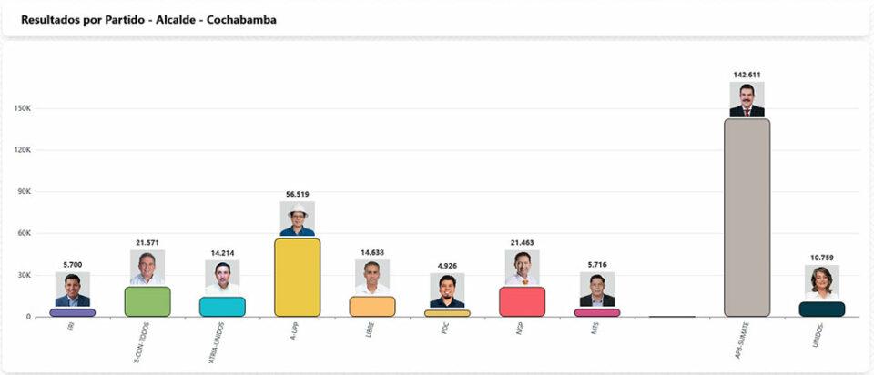 Datos preliminares del sistema SIREPRE del Órgano Electoral Plurinacional dan como posible ganador a Manfred Reyes Villa en la Alcaldía de Cochabamba, con más del 47% de respaldo hasta el momento. Los resultados son parciales y continúan en actualización.