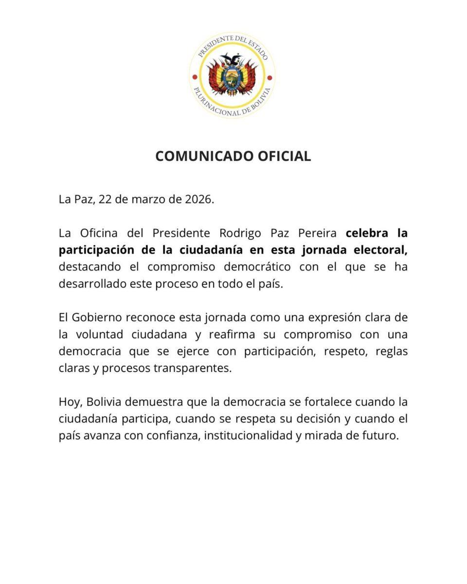 La Paz, 22 de mar 2026 (ATB Digital).- El Gobierno, a través de un comunicado oficial emitido este 22 de marzo, destacó la participación de la ciudadanía en la jornada electoral desarrollada en el país, resaltando el compromiso democrático evidenciado durante el proceso.