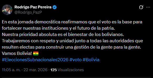 La Paz, 22 de mar 2026 (ATB Digital).- En el marco de la jornada electoral, el presidente del Estado reafirmó que el voto constituye la base para fortalecer las instituciones y proyectar el futuro del país, destacando la importancia de la participación ciudadana en este proceso democrático.