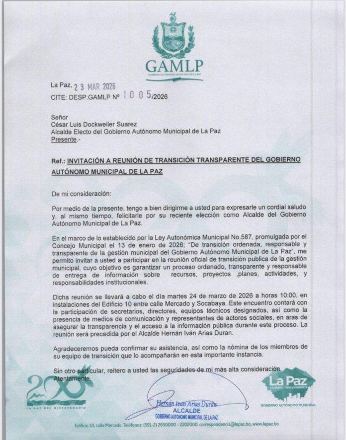 La Paz, 23 de mar 2026 (ATB Digital).- El alcalde de La Paz, Iván Arias, envió este lunes una carta formal al alcalde electo, César Dockweiler, para convocarlo a una reunión que marque el inicio del proceso de transición en la gestión municipal.