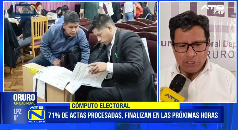 Oruro, 23 de mar 2026 (ATB Digital).- El presidente del Tribunal Electoral Departamental de Oruro, Hernán Quispe, informó que el cómputo de las elecciones subnacionales alcanzó un avance del 71% de actas procesadas. Se prevé concluir el conteo hasta la madrugada de este martes.