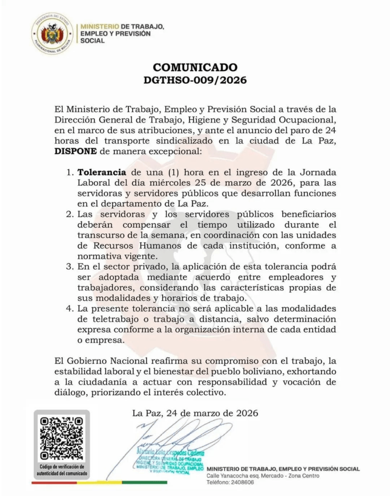 La Paz, 24 de mar 2026 (ATB Digital).- El Ministerio de Trabajo, Empleo y Previsión Social dispuso una tolerancia de una hora en el ingreso a la jornada laboral para este miércoles 25 de marzo de 2026, en el departamento de La Paz, debido al paro de 24 horas anunciado por el sector del transporte.