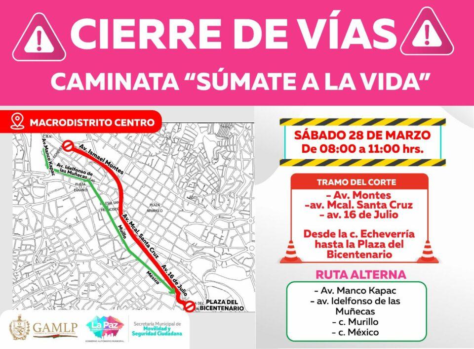 La Paz, 28 de mar 2026 (ATB Digital).- El Gobierno Autónomo Municipal de La Paz informó el cierre temporal de vías en el macrodistrito Centro este sábado 28 de marzo, de 08:00 a 11:00, debido a la realización de la caminata “Súmate a la vida”.