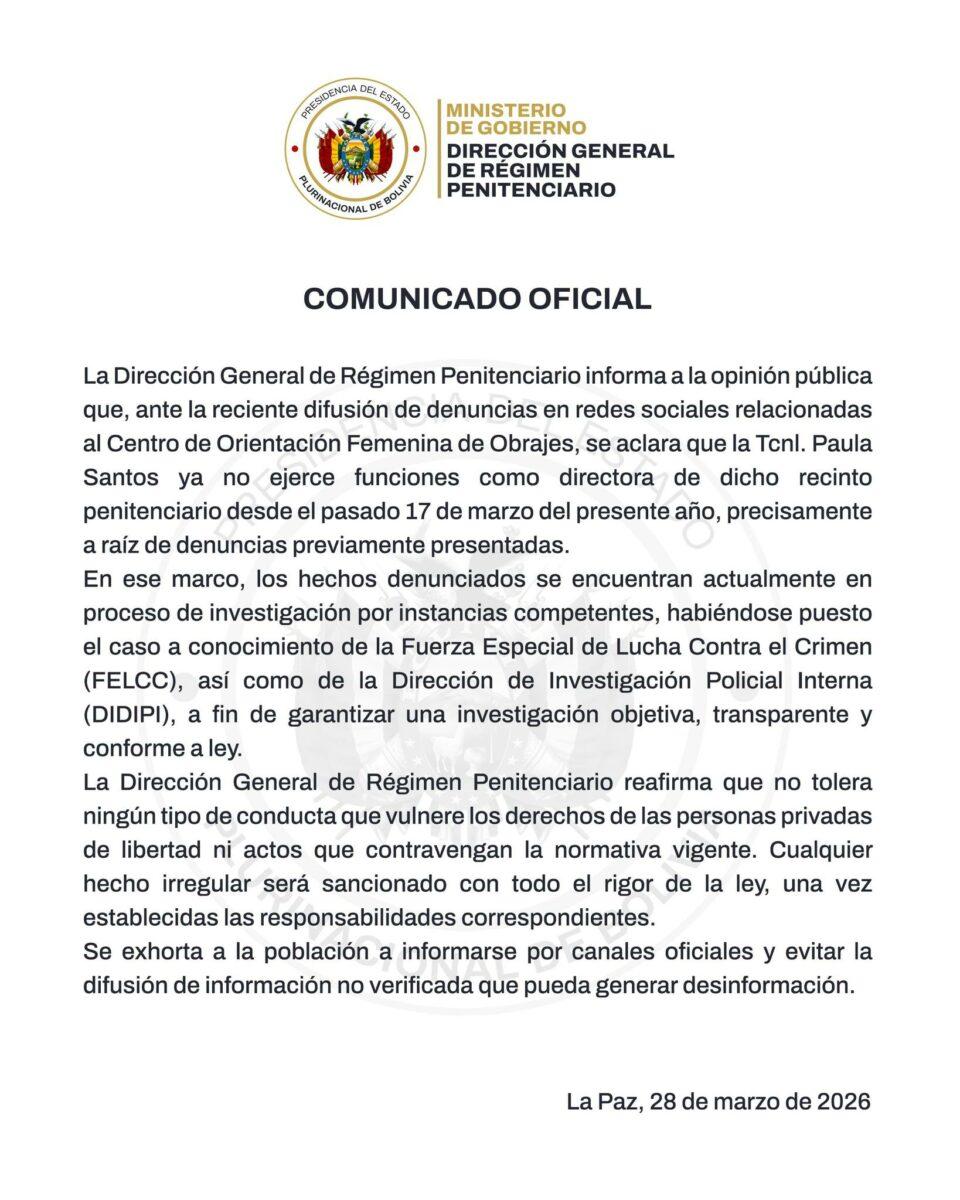 La Paz, 28 de mar 2026 (ATB Digital).- La Dirección General de Régimen Penitenciario informó que la teniente coronel Paula Santos ya no ejerce funciones como directora del Centro de Orientación Femenina de Obrajes desde el 17 de marzo, en medio de denuncias difundidas en redes sociales sobre presuntas irregularidades en ese recinto.