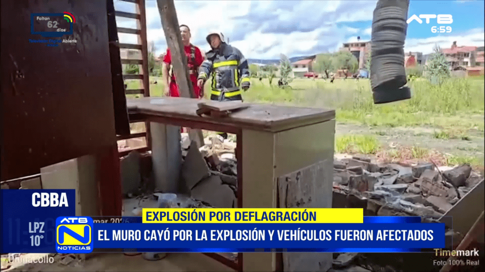 Cochabamba, 29 de mar 2026 (ATB Digital).- Una explosión por deflagración a causa de una fuga de gas se registró en un inmueble de la localidad de Vinto, en Cochabamba, dejando daños en la infraestructura y a una persona de la tercera edad con quemaduras de primer y segundo grado. La misma fue trasladada a un centro médico.