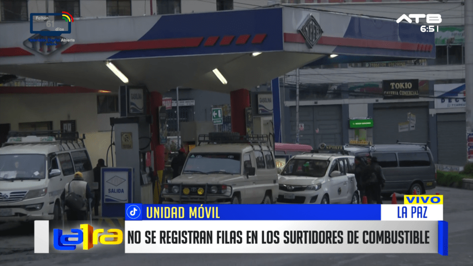 La Paz, 30 de mar 2026 (ATB Digital).- Desde la estación de servicio El Volcán se observa que no existen filas para la carga de combustible, mientras que en la estación Uruguay, ubicada al frente, se registran filas cortas que avanzan con rapidez debido a la fluidez en la atención.