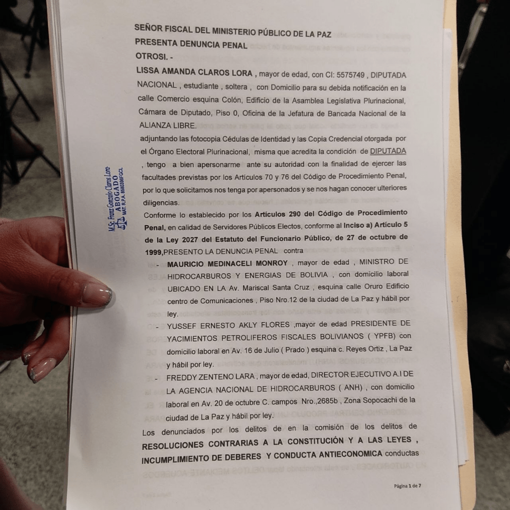 La Paz, 31 de mar 2026 (ATB Digital).- La bancada de Libre presentó una demanda penal contra el expresidente de YPFB, Yussef Akly; el ministro de Hidrocarburos y Energías, Mauricio Medinaceli Monrroy; y el director de la ANH, Freddy Zenteno, por los delitos de resoluciones contrarias a la Constitución, incumplimiento de deberes y conducta antieconómica.