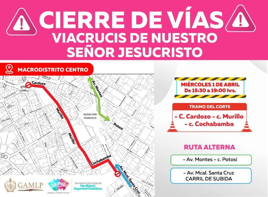La Paz, 1 de abr 2026 (ATB Digital).- Por la realización del Vía Crucis de Nuestro Señor Jesucristo, se anunció el cierre temporal de calles en el macrodistrito Centro este miércoles 1 de abril, desde las 15:30 hasta las 19:00. Las vías afectadas serán las calles Cardozo, Murillo y Cochabamba.