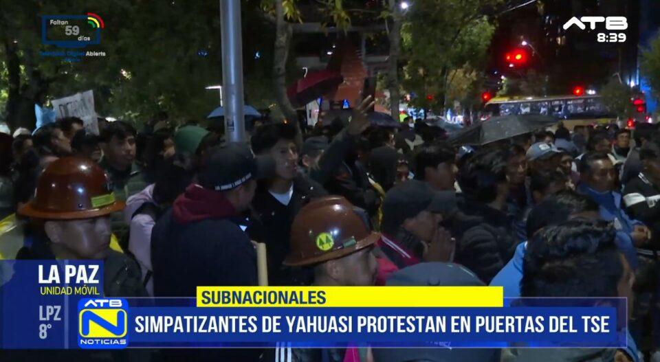 La Paz, 1 de abr 2026 (ATB Digital).- Simpatizantes de René Yahuasi protagonizaron protestas en puertas del Tribunal Supremo Electoral (TSE), exigiendo respeto al voto, tras confirmarse que no continuará en el proceso electoral y que Luis Revilla sería el nuevo gobernador de La Paz.