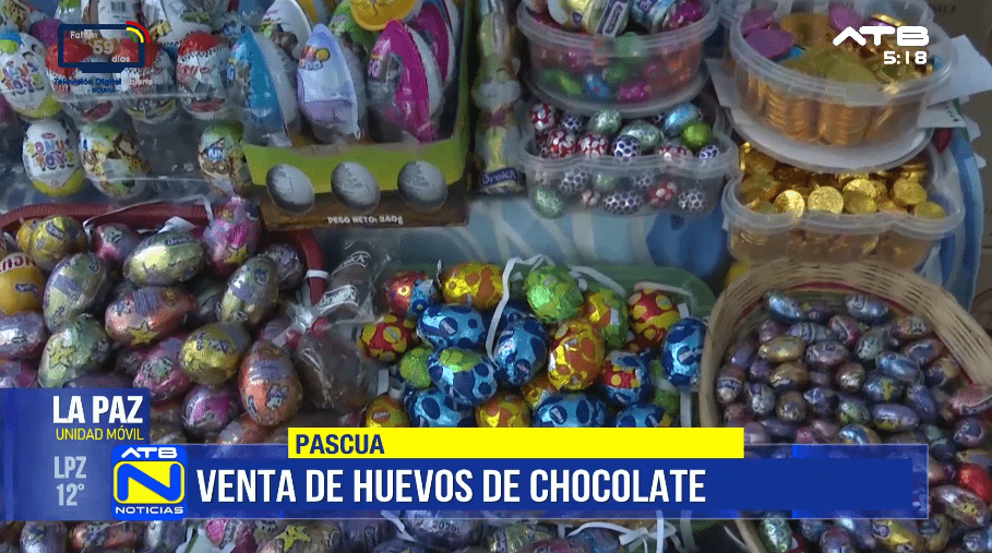 La Paz, 01 de abr 2026 (ATB Digital).- En la ciudad de La Paz, comerciantes ofertan huevos de chocolate de distintas marcas, tamaños y precios, además de productos artesanales por la celebración de Pascua.