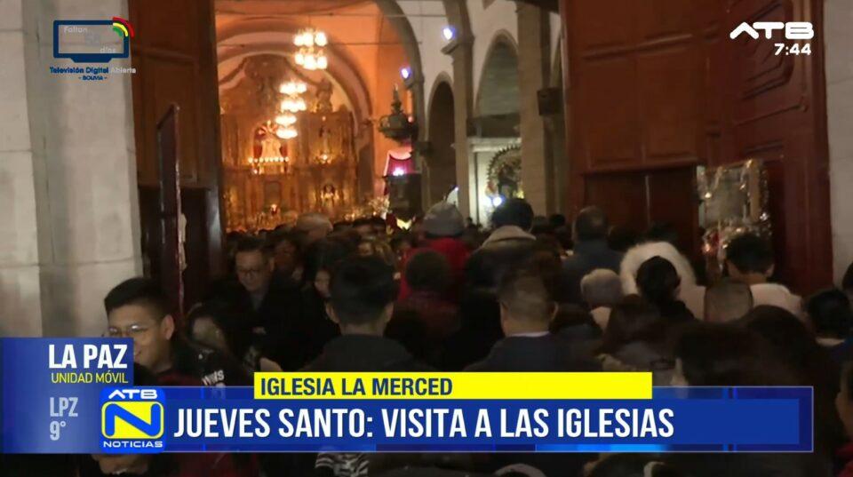 La Paz, 2 de abr 2026 (ATB Digital).- Filas extensas y gran afluencia de fieles se registran en la iglesia La Merced de la ciudad de La Paz durante la tradicional visita a las siete iglesias, en el marco de las celebraciones de Jueves Santo por Semana Santa.
