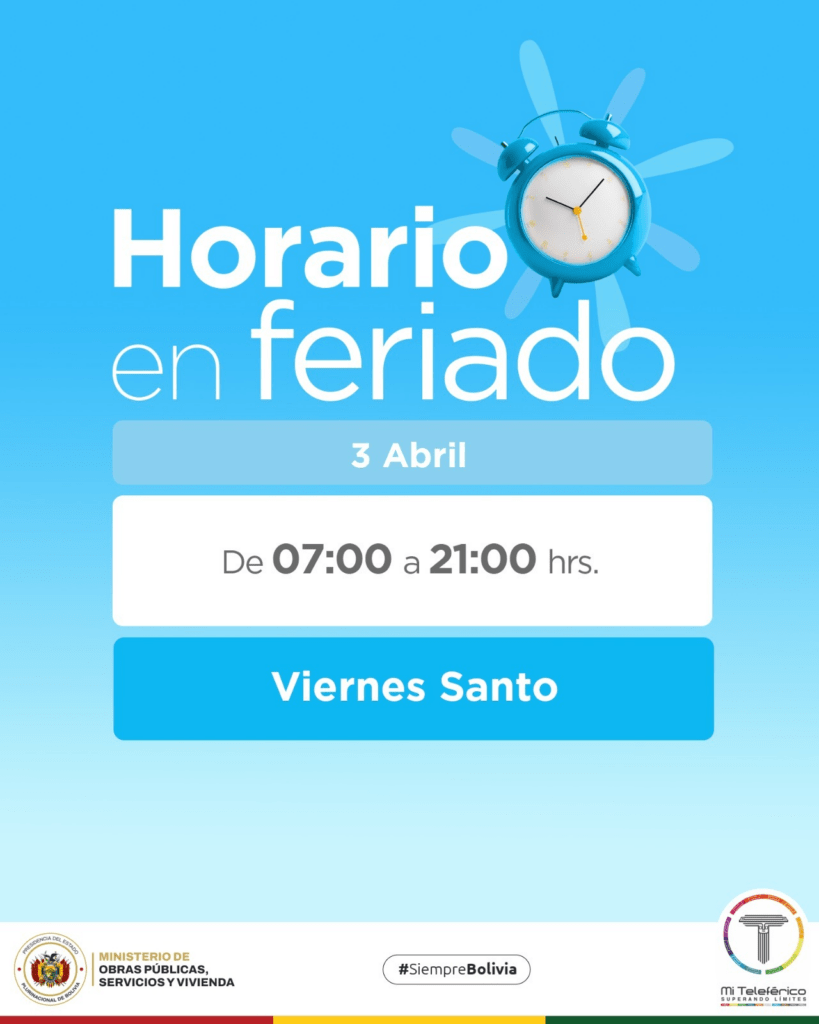 La Paz, 2 abr 2026 (ATB Digital).- La empresa estatal de transporte por cable Mi Teleférico anunció un horario especial durante el feriado del viernes 3 de abril.