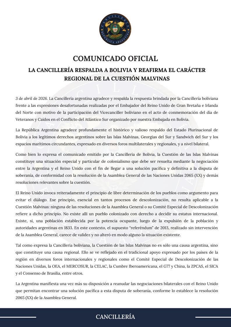 La Paz, 03 de abr 2026 (ATB Digital).- La Cancillería argentina expresó su respaldo a la posición del Gobierno boliviano frente a las declaraciones del embajador del Reino Unido en Bolivia, Richard Porter, en torno a la demanda de soberanía sobre las Islas Malvinas.