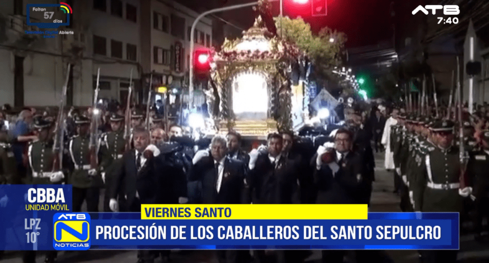 Cochabamba 3 de abr 2026 (ATB Digital).- La tradicional procesión de los Caballeros del Santo Sepulcro recorrió la avenida Heroínas en el centro de Cochabamba, uno de los actos más emblemáticos del Viernes Santo, con la participación de numerosos fieles católicos, autoridades militares y unidades educativas que escoltaron una histórica urna de Cristo.