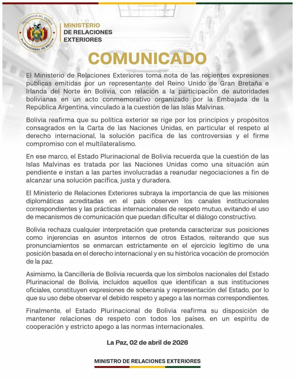 La Paz, 03 de abr 2026 (ATB Digital).- El Ministerio de Relaciones Exteriores de Bolivia emitió un comunicado este 2 de abril en el que toma nota de recientes expresiones de un representante del Reino Unido en el país, relacionadas con la participación de autoridades bolivianas en un acto conmemorativo organizado por la Embajada de Argentina sobre las Islas Malvinas.