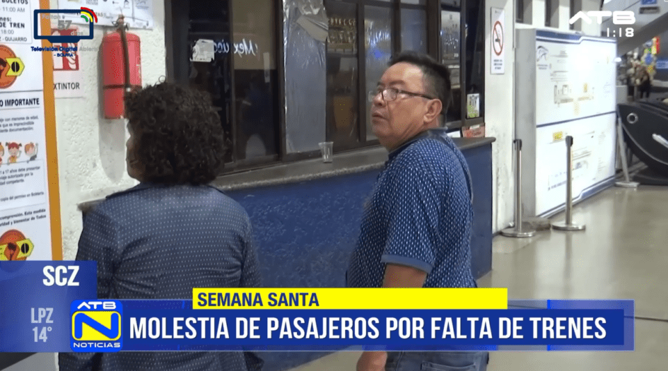 Santa Cruz, 3 de abr 2026 (ATB Digital).- Este Viernes Santo, varios pasajeros acudieron a la Terminal Bimodal de Santa Cruz con la intención de adquirir boletos de tren, sin embargo, se encontraron con la falta de pasajes disponibles, generando molestia entre los usuarios.