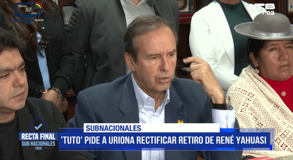 La Paz, 3 de abr 2026 (ATB Digital).- Jorge Quiroga solicitó públicamente a Édgar Uriona que se traslade a la ciudad de La Paz para rectificar la decisión de retirar la candidatura de René Yahuasi de la segunda vuelta electoral por la Gobernación paceña.