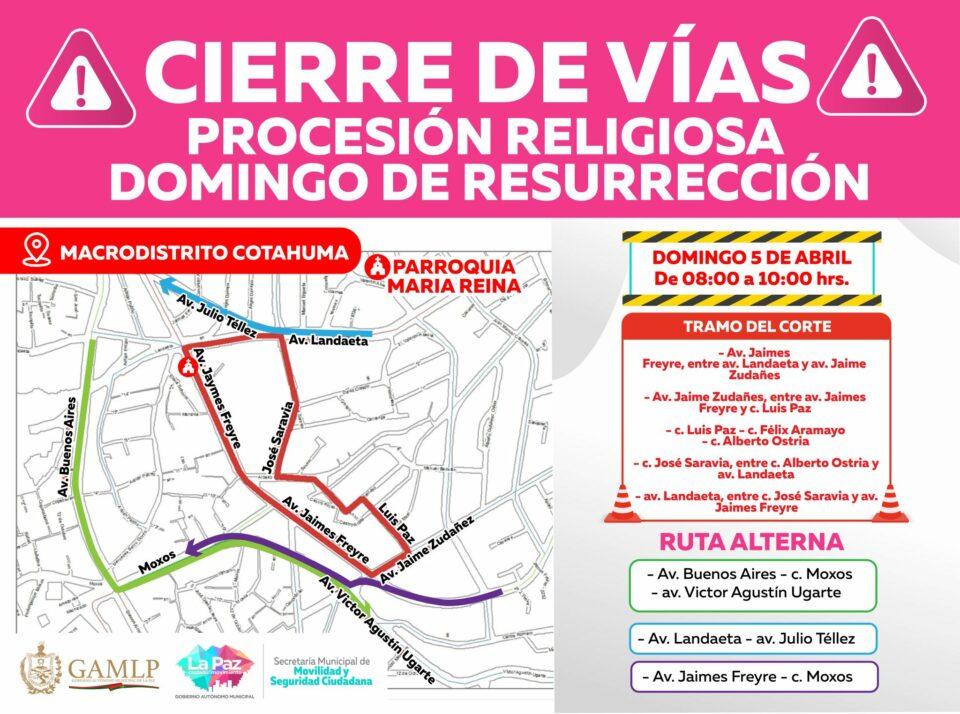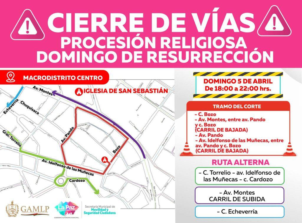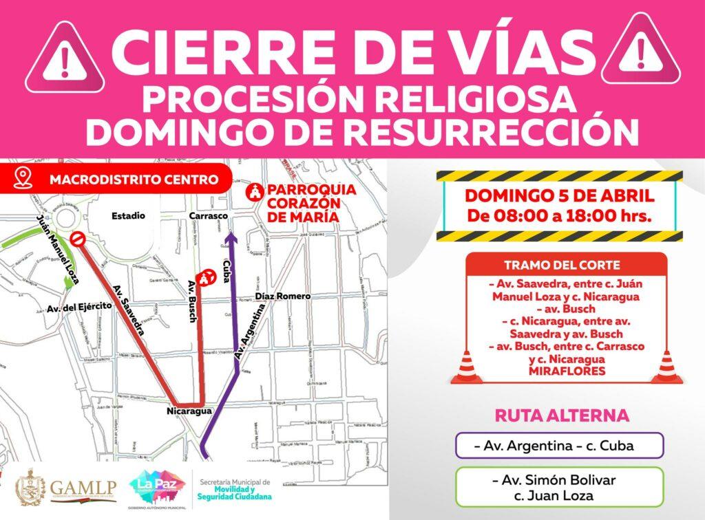 La Paz, 04 de abr 2026 (ATB Digital).- La Alcaldía de La Paz anunció el cierre temporal de varias vías este domingo 5 de abril debido a procesiones religiosas por el Domingo de Resurrección en distintos sectores de la ciudad.
