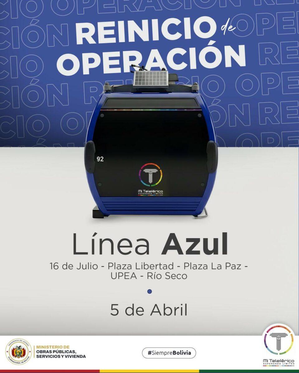 La Paz, 04 de abr 2026 (ATB Digital).- Las líneas azul y amarilla de Mi Teleférico retomarán sus operaciones este 5 de abril, tras la conclusión de un mantenimiento programado.