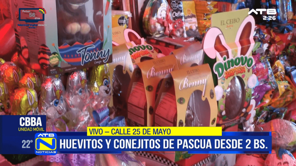 Cochabamba, 4 de abr 2026 (ATB Digital).- Comerciantes de la calle 25 de Mayo, en Cochabamba, ofrecen una amplia variedad de chocolates de Pascua, entre huevitos y conejitos, con precios desde Bs 2. En los puestos se pueden encontrar productos de distintas marcas y presentaciones, dirigidos a todo tipo de público. Asimismo, invitan a la población a visitar el mercado, donde destacan la variedad y calidad de los productos disponibles en esta temporada.