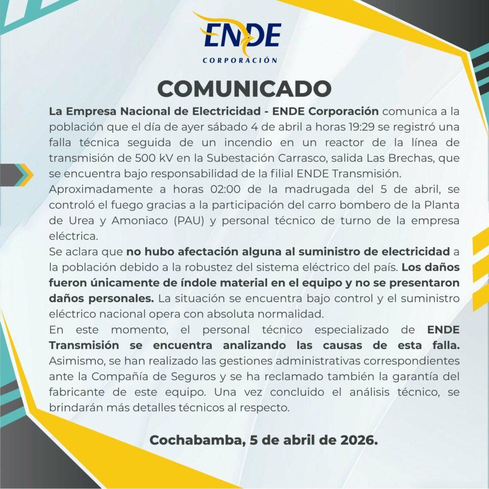 Cochabamba, 05 de abr 2026 (ATB Digital).- La Empresa Nacional de Electricidad (ENDE) informó que el sistema eléctrico nacional opera con absoluta normalidad y sin interrupciones para la población, tras la falla técnica registrada la noche del sábado 4 de abril a las 19:29 en un reactor de la línea de transmisión de 500 kV en la Subestación Carrasco, salida Las Brechas, en Cochabamba.