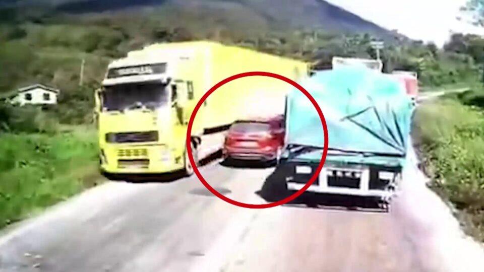 En los registros se observa cómo un vehículo queda atrapado entre dos camiones tras una maniobra riesgosa. Desde Tránsito informaron que ya se instruyó identificar al motorizado y al conductor para aplicar las sanciones correspondientes.
