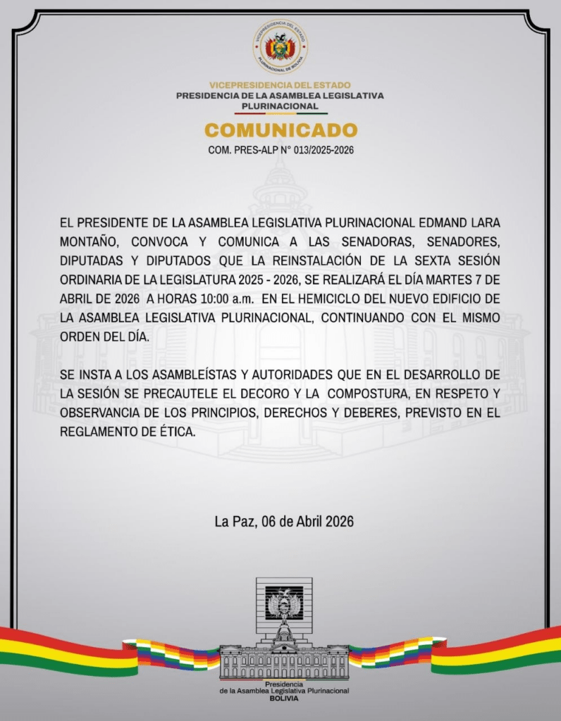 La Paz, 6 abr 2026 (ATB Digital).- El vicepresidente Edmand Lara Montaño convoca a la reinstalación de la sexta sesión ordinaria en la Asamblea Legislativa para continuar con la interpelación al ministro de Hidrocarburos y Energías, Mauricio Medinaceli.