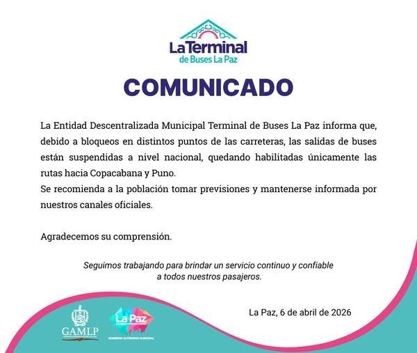 La Paz, 6 de abr 2026 (ATB Digital).- La Terminal de Buses de La Paz informó la suspensión de salidas a nivel nacional debido a bloqueos en distintos puntos de las carreteras. La medida restringe temporalmente el transporte interdepartamental.