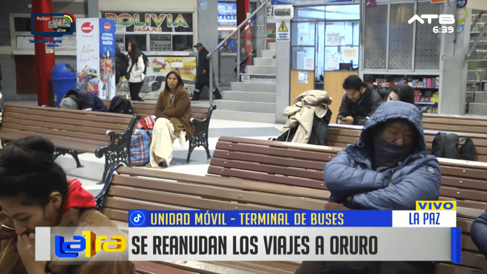 La Paz, 8 de abr 2026 (ATB Digital).- Desde la Terminal de Buses de La Paz se informó la reanudación de los viajes hacia Oruro, luego de que se firmara un acuerdo que permitió levantar las medidas de presión.