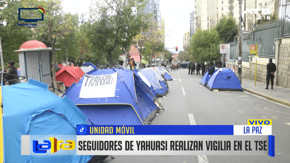 La Paz, 8 de abr 2026 (ATB Digital).- Seguidores de René Yahuasi se mantienen en vigilia en inmediaciones del Tribunal Supremo Electoral, en demanda de respuestas sobre su situación electoral.